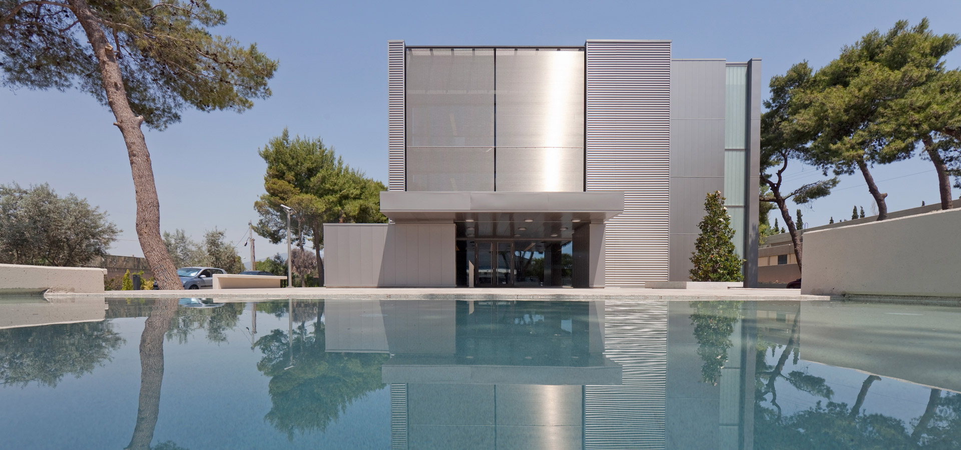 This office building was designed to house the headquarters of a pharmaceutical company and is comprised of three above the ground and two underground floors. The offices, the meeting rooms, a restaurant, a canteen and a library are situated on the above the ground floors, while the underground spaces serve mainly for parking and auxiliary uses. A large area of the first basement is occupied by a multi-purpose hall that can be used as either a single large hall or three smaller ones. The shape of the plot, the building code restrictions, and the existence of pine trees rows on the site determined the form of the building which is a single elongated rectangular volume, with minor projections and recesses along its length. The building is organized into two wings with two entrances and three service cores (stairs – elevators – restrooms). In order to meet the company’s demands, the interior was divided into a large number of offices and meeting rooms of diverse sizes, through the use of a 7.40m column grid on the long side of the building. Offices and meeting rooms are accommodated in a minimum width of 3.70m. To ensure affluent natural lighting and uninhibited views of the exterior, large surfaces of glazing were installed on all elevations. Sun shading was achieved mainly through stainless steel meshes, specially selected so as to reduce direct sunlight incidence by approximately 60% and at the same time to allow for uninterrupted views of the surrounding landscape.